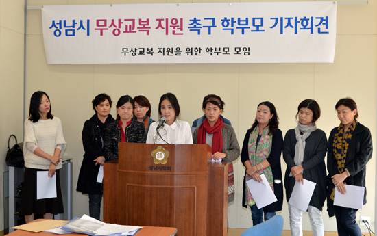 | ▲ "보건복지부 장관님, 살림해보셨나요?" 무상교복 지원을 위한 성남시 학부모 모임은 기자회견을 열고 보건복지부에 "무상교복 지원 정책을 조속히 수용하라"고 촉구했다. |