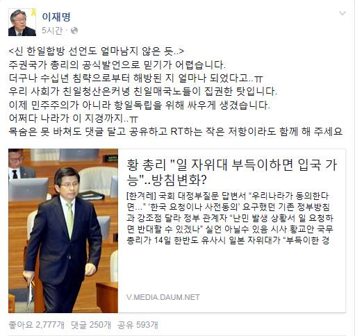 황교안 국무총리가 “부득이한 경우 (일본 자위대가) 우리나라의 동의를 얻어 입국할 수 있다”고 발언한 것을 놓고 파문이 확산되고 있습니다. 이재명 성남시장은 특히 페이스북에서 “신 한일합방 선언이 머지 않은 듯하다”며 맹비난했습니다. 15일 페북지기 초이스입니다.