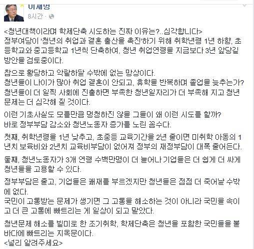 이재명 성남시장은 24일 자신의 페이스북을 통해 “청년대책이라며 학제단축 시도하는 진짜 이유는?..심각합니다”라는 글을 올렸다.