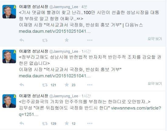 앞서 “국정화 행정협조거부 성남시 성명서”라는 글을 통해 “성남시는 박근혜 정부의 역사교과서 국정화 홍보를 위한 행정협조 거부를 선언”이라고 적었다.