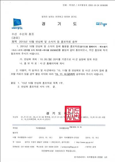 | ▲ 교유부가 행자부, 경기도를 통해 성남시에 보낸 협조 공문. |