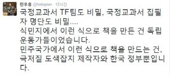 역사학자 전우용씨는 트위터에 “국정교과서 TF팀도 비밀, 국정교과서 집필자 명단도 비밀”이라며 “식민지에서 이런 식으로 책을 만든 건 독립운동가들이었습니다. 민주국가에서 이런 식으로 책을 만드는 건, 극저질 도색잡지 제작자와 한국 정부뿐”이라고 적었다.