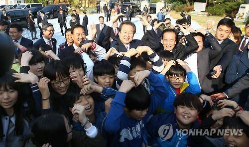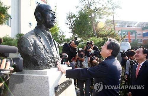 (경주·포항=연합뉴스) 류미나 기자 = 새누리당 김무성 대표는 29일 '친일 행적 논란'이 일고 있는 선친 김용주 전 전남방직 회장이 설립한 경북 포항 영흥초등학교를 방문했다.