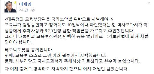 이재명 시장은 31일 밤 자신의 페이스북에 ‘대통령과 교육부장관을 국가보안법 위반으로 처벌해야..’라는 제목의 글을 올리고 현행 검인정 교과서를 제대로 가려내지 못한 책임이 있다고 비판했다.