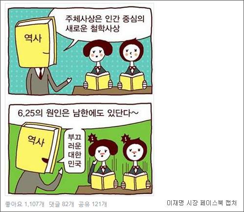 이어 “빼도박도 못 할 증거”라면서 “첫째, 교육부 스스로 그린 아래 웝툰에서 자백했다.둘째, 새누리당도 국사교과서가 주체사상 가르쳤다고 현수막 붙였다”고 적었다.