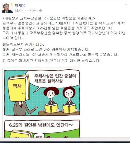 이 시장은 “교육부가 검정승인하고 청와대도 10일씩이나 확인했다는 현 역사교과서가 학생들에게 주체사상과 6.25전쟁 남한 책임론을 가르치고 주입했답니다”라며 “그러니 대통령과 교육부장관은 명백한 종북 빨갱이로 국가보안법에 의해 처벌되어야 합니다”라고 강조했다.