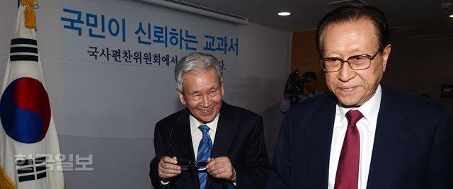김정배(오른쪽) 국사편찬위원장이 4일 정부서울청사에서 국정 한국사 교과서 집필 관련 기자회견을 마치고 회견장을 나서는 모습을 대표집필자로 소개된 신형식 이화여대 명예교수가 웃으며 지켜보고 있다. 다른 대표집필자인 최몽룡 서울대 명예교수는 제자들의 반대로 회견장에 나오지 않았다. 고영권기자 youngkoh@hankookilbo.com