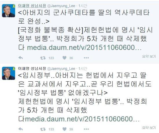 이재명 성남시장은 6일 자신의 트위터를 통해 “아버지의 군사쿠데타를 딸의 역사쿠데타로 완성”이라고 적었다.