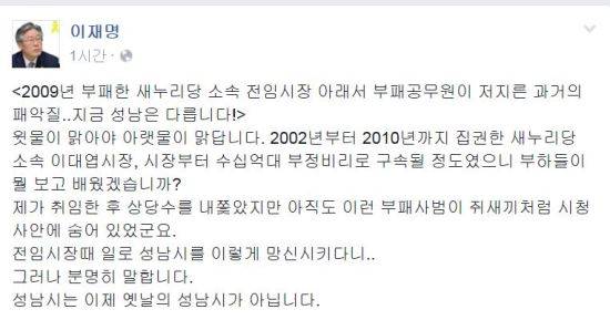 이재명 성남시장은 11일 자신의 페이스북을 통해 “2009년 부패한 새누리당 소속 전임시장 아래서 부패공무원이 저지른 과거의 패악질”이라며 “지금 성남은 다릅니다!”라고 적었다.
