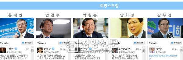 새정치민주연합의 사회관계망서비스(SNS) ‘희망스크럼’이 떴다. 당내 대선 주자와 국회의원들의 SNS를 하나의 인터넷 페이지에서 한 눈에 볼 수 있는 ‘SNS 스크럼’(http://www.scrum.co.kr)를 16일 전격 공개했다.