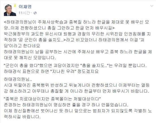 이재명 성남시장은 19일 자신의 페이스북을 통해 “하태경의원님이 주체사상학습과 종북질 하느라 한글을 제대로 못 배우신 모양..이제 전향하셨으니 총질 그만하고 한글 먼저 배우시길”이라고 적었다.