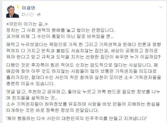 이재명 성남시장은 25일 자신의 페이스북에 ‘국민이 이기는 길’이라는 글을 올렸다.