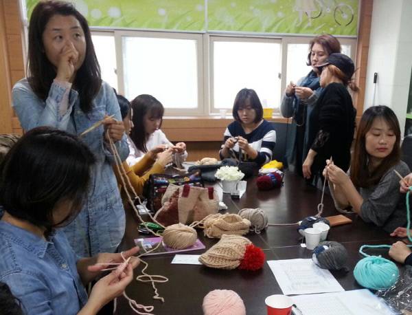| 재능 기부로 운영 중인 손뜨개 교실에서 주민들이 뜨개질을 배우고 있다. |