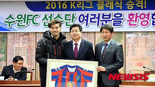 【수원=뉴시스】이정선 기자 = 8일 오후 경기도 수원시청에서 열린 수원FC 2016 K리그 클래식 승격 환영 행사에서 염태영 수원시장과 수원FC 조덕제 감독, 자 파 선수가 기념촬영을 하고 있다. 2015.12.08.