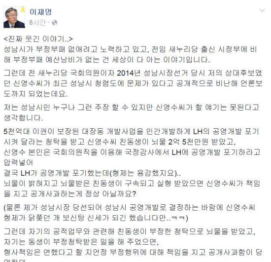이재명 성남시장은 10일 자신의 페이스북을 통해 ‘진짜 웃긴 이야기’라는 글을 올렸다.