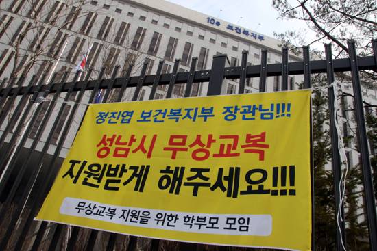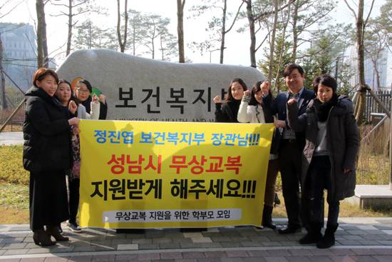 성남지역 학부모회장과 학교운영위원으로 구성된 '무상교복 추진을 위한 학부모 모임'은 최근 보건복지부가 성남시의 무상교복 정책에 대해 소득 수준에 따라 차등 지원할 것을 요구하며 재협의를 통보한 데 반발하며 보건복지부에 무상교복 정책 수용을 강력히 촉구했다.