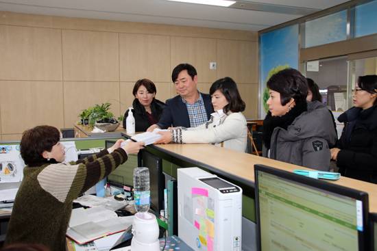 | ▲ 무상교복 재협의, 엄마들이 뿔났다!! '무상교복 추진을 위한 학부모 모임' 회원들이 보건복지부 민원실에 무상교복 합의 촉구 건의문과 성남시 학부모 1000명의 서명지를 전달하고 있다. |