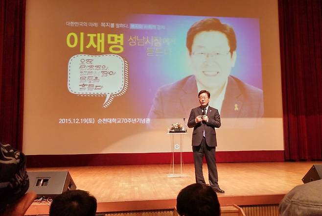 이재명 성남시장이 19일 국민TV와 순천·여수의 시민단체가 초청한 강연에서 정부 복지정책을 비판했다. 청년배당과 무상교복등을 주장하며 정부와 대립하고 있는 이 시장은 거침없는 발언으로 요즘 젊은이들에게 주목을 받고 있다. 순천대 강당의 포스터에 적힌 이 날 강연 제목도 "복지정책, 돈이 없어 못 한다는 것은 새빨간 거짓말이다"이다.