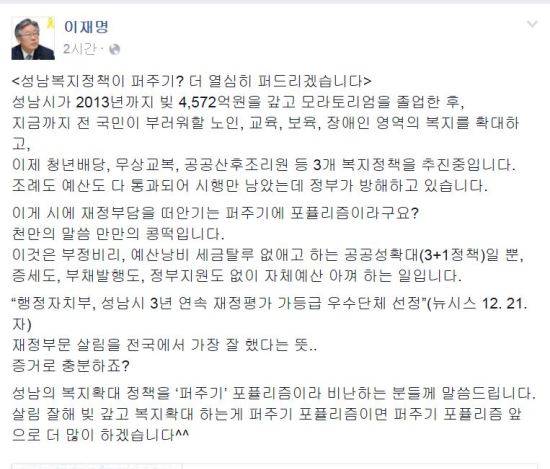 이 시장은“성남의 복지확대 정책을 ‘퍼주기’ 포퓰리즘이라 비난하는 분들께 말씀드립니다”라며 “살림 잘해 빚 갚고 복지확대 하는게 퍼주기 포퓰리즘이면 퍼주기 포퓰리즘 앞으로 더 많이 하겠습니다”라고 말했다.