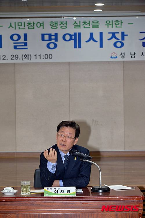 【성남=뉴시스】 이정하 기자 = 29일 경기 성남시청 한누리실에서 열린 '성남시 1일 명예시장 간담회'에서 이재명 성남시장이 "시장의 역할은 일종의 통로다. 시민의 뜻이 무엇인지 찾아 시민을 위해 제대로 잘 쓰는 것이 대리인인 시장의 몫이다. 시민과 시정을 연결하는 가장 큰 다리가 명예시장"이라고 말했다. 이 날 간담회에는 성남시민으로 구성된 2014년, 2015년도 1일 명예시장으로 활동한 45명이 참석해 연도별 대표자를 선출하고 시정 발전방향에 대한 의견을 나눴다. 2015.12.29 (사진=성남시 제공)