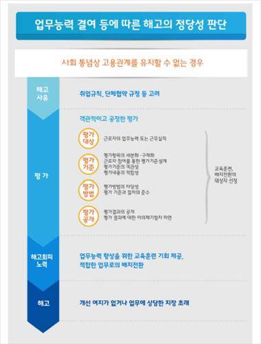 공정하고 객관적인 평가와 이를 토대로 한 교육훈련, 배치전환의 기회 등을 줬음에도 업무능력 또는 성과 개선의 여지가 없거나, 업무의 상당한 지장을 초래할 때는 근로자를 해고할 수 있다고 밝혔다.