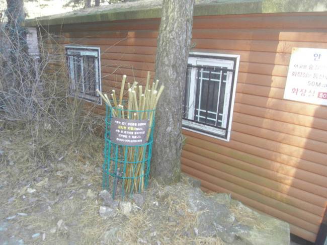 이들 지팡이는 눈이 언 등산길에 시민이 미끄러지지 않도록 성남시 녹지과 등산로 관리원 4명이 일일이 수작업해 만들었다.