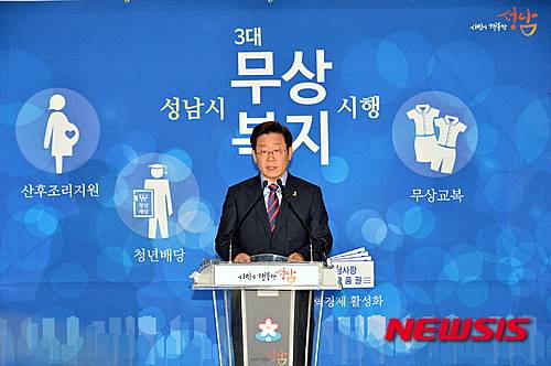 【성남=뉴시스】 이정하 기자 = 이재명 경기 성남시장이 4일 시청 한누리실에서 기자회견을 열고 정부의 반대에도 불구하고 올해부터 청년배당과 교복지원, 공공산후조리지원 등 성남시 3대 무상복지사업을 전면 시행한다고 선포했다. 2016.01.04 (사진=성남시 제공)