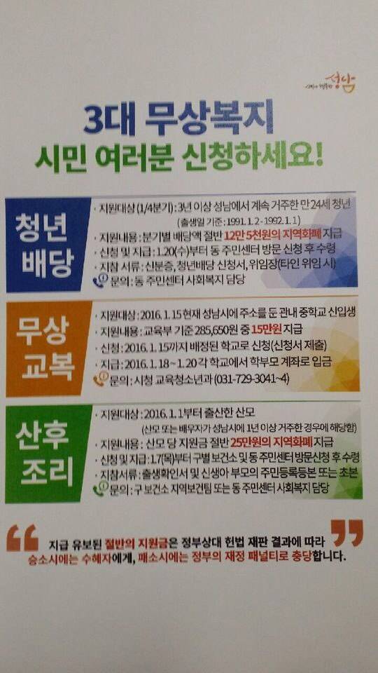 [헤럴드경제=박정규(성남)기자] 정부의 반대와 경기도 재의요구에도 불구하고 이재명 성남시장의 청년배당 무상교복 공공산후조리원 등 무상복지 3대사업의 수혜자 지급(1/4분기)이 7일부터 시작됐다.