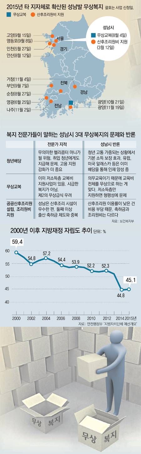 경기 성남시가 3대 무상복지(청년배당, 무상교복, 공공산후조리 지원)를 추진한 뒤 다른 지방자치단체들도 표(票)를 위한 복지의 유혹에 빠져들고 있는 것으로 나타났다.