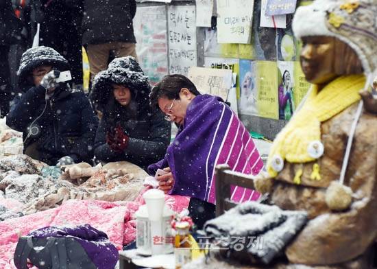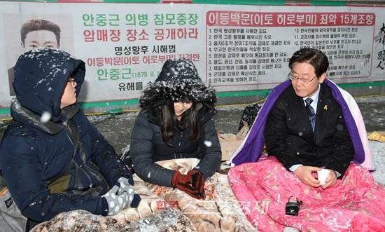 이재명 성남시장이 13일 오후 서울 종로구 일본대사관 앞 소녀상을 찾아 길거리 농성중인 대학생들과 함께 소녀상을 지키고 있다.