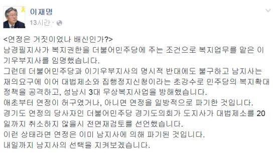 이재명 성남시장은 20일 자신의 페이스북을 통해 “연정은 거짓이었나 배신인가?”라는 글을 올렸다.