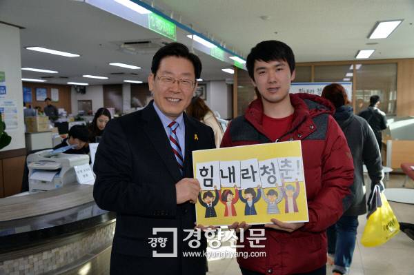 이재명 성남시장은 이날 오전 중원구 금광2동 주민센터에서 청년배당금을 받은 청년들을 만나 격려했다. 이 시장은 “원래 연간 100만원인데 정부 반대로 절반만 주고 나머지는 소송에서 이기면 주겠다”며 청년들과 함께 ‘힘내라 청춘 파이팅’을 외쳤다. 올 2월 대학을 졸업하는 취업준비생 문모씨(24)는 “말들이 많지만 일정기간 지역에 거주한 모든 청년에게 도움을 주겠다는 청년배당 정책을 긍정적으로 생각한다”며 “더 확대됐으면 좋겠다”고 말했다.
