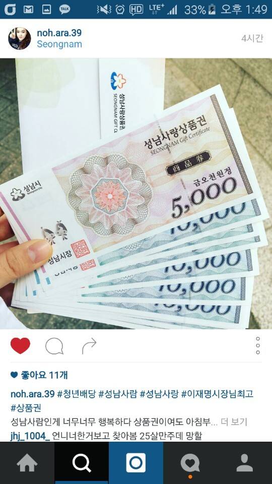 게시물에는 “분당에 20년넘게 살았더니 이런일이”,“난 오늘 청년배당을 받았다” “알차게 잘쓰겠습니다” “성남사람이어서 너무 행복하다” “역시 살기좋은 성남” ‘나의 가정을 위해 자알 쓰게슴” “설에 엄마 장보는데 보태써야겠다” 는등의 글이 이어지고있다.