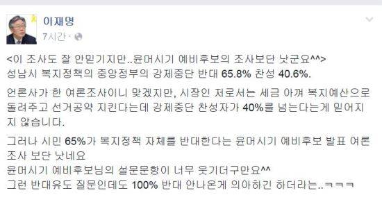 이 시장은 "성남시 복지정책의 중앙정부의 강제중단 반대 65.8% 찬성 40.6%"이라고 인용했다.