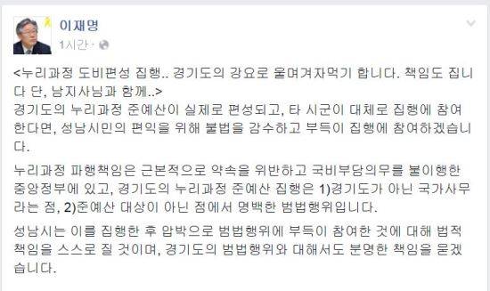 이재명 성남시장은 22일 자신의 페이스북을 통해 “누리과정 도비편성 집행.. 경기도의 강요로 울며겨자먹기 합니다”라며 “책임도 집니다 단, 남경필 지사님과 함께”라고 적었다.