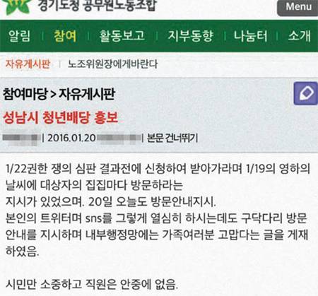 경기도청 공무원노동조합의 온라인 사이트에 20일 올라온 글이다. 3대 무상복지(청년배당, 무상교복, 산후조리비 지원)를 강행하고 있는 이재명 경기 성남시장을 비판하고 있다. 시 공무원들을 청년배당 대상자의 가정에 직접 방문시켜 수령을 독려하게 한다는 주장이 담겨 있다.