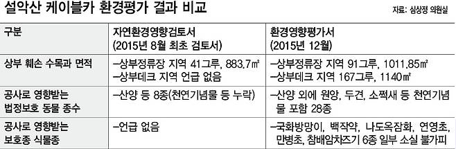 환경영향평가서에 9만2220㎡로 제시한 상부 정류장 건설에 따른 식생영향 범위도 국립공원위원회 심의 때는 7분의 1에 불과한 1만3210㎡로 축소보고했다. 또 공사로 영향을 받을 법정보호 동물 종수도 환경영향평가서에서는 원앙 등 천연기념물을 포함해 28종이라고 제시했지만 국립공원위원회에는 천연기념물들을 제외하고 산양 등 8종에 지나지 않는다고 보고했다.