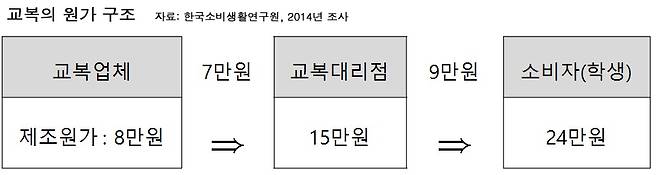 이런 현상이 과열되면서 2007년에는 70만원대의 고가 교복이 나왔다. 결국 그해 국무회의에서까지 의제로 거론되고, 공정거래위원회는 교복 가격의 짬짜미(담합) 여부를 조사하기 시작했다. 이후 교복시장 혼탁은 공정위 조사 및 처벌의 단골 메뉴가 됐다. 2009년에는 대리점 재고 전가, 2012년에는 학생을 동원한 과잉판촉, 2013년에는 일부 지역 대리점의 담합이 다시 적발되는 등 교복시장은 ‘불공정행위의 백화점’으로 얼룩져 있다. 게다가 2014년 초에는 24만원대 교복의 원가가 8만원에 불과하다는 조사 결과가 나오며 거품 논란까지 본격화됐다. 당시 한국소비생활연구원이 정부 용역으로 조사한 결과에 따르면, 교복 원가는 임가공비 5만원과 원부자재비 3만원을 합쳐 8만원대로 추정됐다. 여기에 광고비, 운송비, 보관비 등 간접비와 영업이익이 더해져 대리점으로 넘어갈 때의 출고가는 15만원이 된다. 이를 대리점에서 다시 영업마진을 붙여 학부형들은 평균 24만원에 사는 것으로 나타났다.