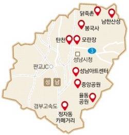 [서울신문]성남시는 경기도 한가운데 자리잡고 있다. ‘시민이 행복한 성남’이란 슬로건 아래 급격하게 성장한 성남시는 이젠 복지도시로 질적 발전을 꾀하고 있다. 현재 인구는 97만명에 이르며 곧 100만명을 넘어 제2의 도약을 꿈꾼다. 서울 중심부에서 한강을 접한 동남방 26㎞ 거리에 있다. 성남은 서럽고 아픈 기억을 갖고 태어났지만 지금은 가장 살기 좋은 도시로 손꼽힌다. 동쪽으로 광주시 중부면과 하남시에, 서쪽은 과천시와 의왕시, 남쪽은 용인시 수지와 광주 오포, 북쪽은 서울 강남·송파구와 접한다. 1968년 시작된 서울시의 무허가 건물 철거 정책에 따라 서민들이 대거 이주하면서 도시가 형성됐다. 1973년 광주시에서 독립돼 새로운 도시가 됐다. 분당신도시가 들어서고 판교 개발이 이뤄지면서 ‘제2의 강남’이라 불린다. 재정자립도가 지난해 전국 5위 안에 들 만큼 ‘가난’과는 어울리지 않는 도시가 됐다. 볼만한 옛것은 적지만, 도시 성장과 함께 생겨난 현대적 볼거리와 자랑거리가 넘쳐 나는 ‘누구나 살고 싶은 도시’가 됐다.
