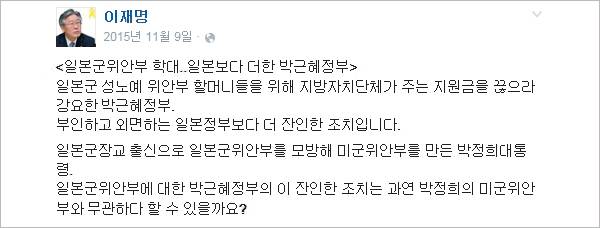이 시장은 그간 성남 시정(市政)과는 전혀 관계없는 정치 현안들에 대한 발언을 쉼 없이 쏟아내고, 개인적인 의견을 달아 논란을 일으켜왔다. 지난 29일 김무성 새누리당 대표가 저출산 대책으로 중국 동포(조선족) 수용을 주장하자 페이스북에 '조선족이 애 낳는 기계도 아닌데 조선족 비하'라고 주장했다. 박근혜 대통령 비판도 단골 메뉴다. 그는 지난해 11월 "일본군 장교 출신으로 일본군위안부를 모방한 미군 위안부를 만든 박정희 대통령"이라고 했다. 비슷한 시기 광화문광장에서 벌어진 민노총 주도 폭력 시위에 대해 '1980년 광주의 피바람이 생각난다'며 '모두가 떨쳐 일어날 때'라고도 했다.