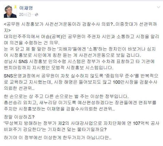 이재명 성남시장은 3일 자신의 페이스북을 통해 “공무원 시정홍보가 사전선거운동이라 검찰수사 의뢰?..이중잣대가 선관위까지”라고 말했다.