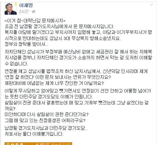 이재명 성남시장은 6일 자신의 페이스북을 통해 “이거 참~대략난감 문자메시지”라며 “조금 전 남경필 경기도지사님에게서 온 문자메시지입니다”라고 소개했다.