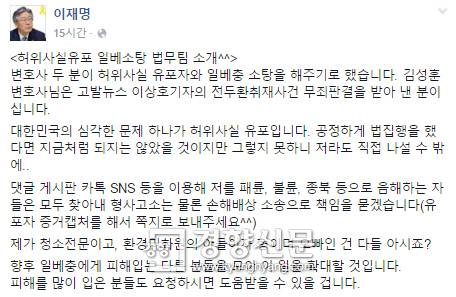 이 시장은 “변호사 두 분이 허위사실 유포자와 일베충(일베와 벌레를 뜻하는 한자 蟲의 합성어) 소탕을 해주기로 했다”며 “대한민국의 심각한 문제 하나가 허위사실 유포다. 공정하게 법 집행을 했다면 지금처럼 되지는 않았겠지만 그렇지 못하니 저라도 직접 나설 수밖에 없다”고 밝혔다. 이 시장은 또 “댓글 게시판 카톡 SNS 등을 이용해 저를 패륜, 불륜, 종북 등으로 음해하는 자들을 모두 찾아내 형사고소는 물론 손해배상 소송으로 책임을 묻겠다”고 경고했다. 이 시장은 “피해를 많이 입은 분들도 요청하시면 도움받을 수 있을 것”이라며 향후 일베충에게 피해를 입은 다른 분들의 사례도 모아 소탕의 범위를 확대하겠다는 뜻도 전했다.