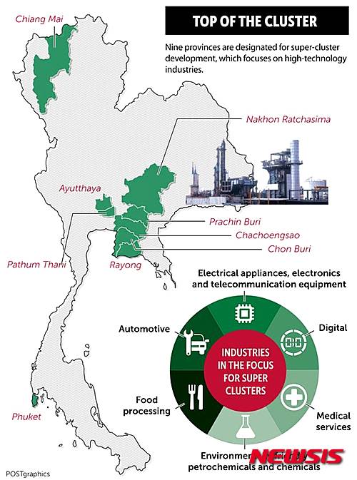 앞서 태국 정부는 지난 2014년 11월 '디지털이코노미정책'에 발표하고 치앙마이, 푸켓 등 주요 도시 9곳을 대상으로 디지털, 자동차, 전자・통신장비, 석유・친환경화학, 푸드, 의료허브 중심의 6대 클러스터 구축사업에 착수했다.