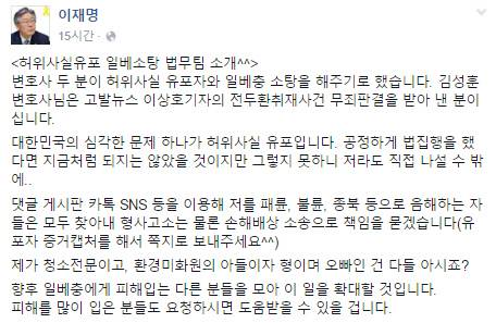 이재명 경기 성남시장이 극우성향 온라인 커뮤니티 사이트 일간베스트(일베)의 악성 댓글 게시자와의 전쟁을 선포했다고 경향신문이 보도했다. 이 시장은 16일 자신의 페이스북을 통해 허위사실을 유포한 일베 회원들에 대해 법적 대응에 나선다며 사진과 함께 소송을 진행할 법무팀도 소개했다.