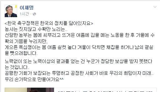 이재명 성남시장은 20일 자신의 페이스북을 통해 “한국 축구정책은 한국의 정치를 닮아있지요”라고 말했다.