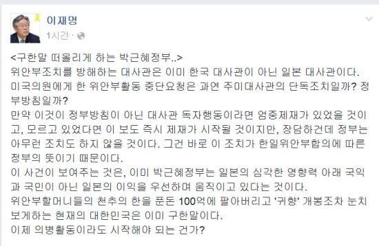 이 시장은 “만약 이것이 정부방침이 아닌 대사관 독자행동이라면 엄중제재가 있었을 것이고, 모르고 있었다면 이 보도 즉시 제재가 시작될 것이지만, 장담하건데 정부는 아무런 조치도 하지 않을 것이다”라며 “그건 바로 이 조치가 한일위안부합의에 따른 정부의 뜻이기 때문이다”라고 했다.