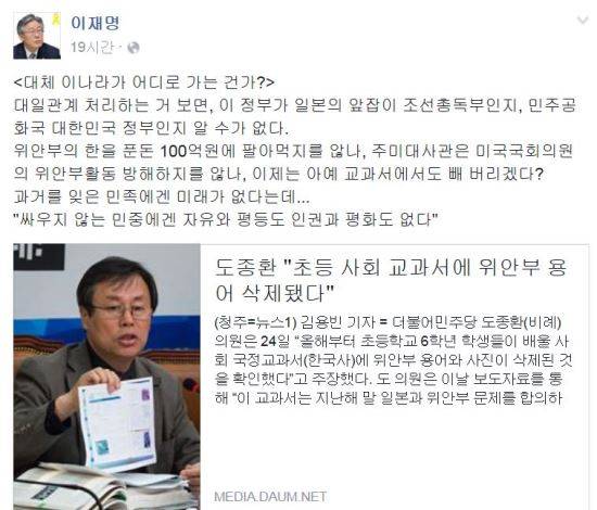 그는 “위안부의 한을 푼돈 100억원에 팔아먹지를 않나, 주미대사관은 미국국회의원의 위안부활동 방해하지를 않나, 이제는 아예 교과서에서도 빼 버리겠다?”라고 했다.