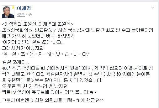 이재명 성남시장은 27일 자신의 페이스북을 통해 “이석현과 조원진..이재명과 조원진”이라는 글을 올렸다.