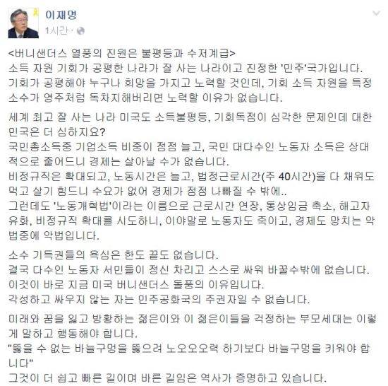 이재명 성남시장은 4일 자신의 페이스북을 통해 “버니샌더스 열풍의 진원은 불평등과 수저계급”이라는 글을 올렸다.